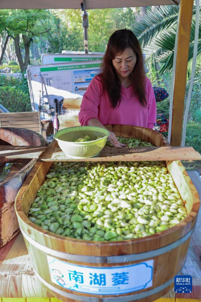 10月12日,在南湖邊的南湖菱銷(xiāo)售點(diǎn),工作人員在整理剛剛采摘來(lái)的新鮮南湖菱。