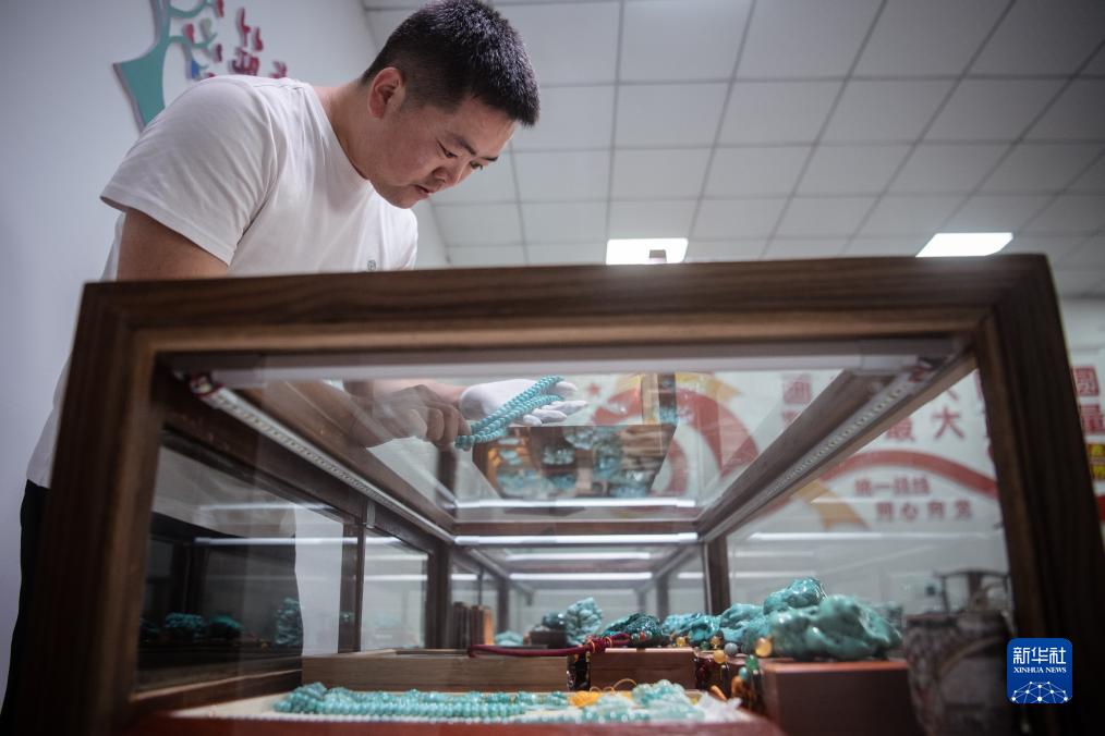 10月11日,湖北省鄖西縣下?tīng)I村村民庹濤在查看展銷(xiāo)柜臺內的綠松石制品。