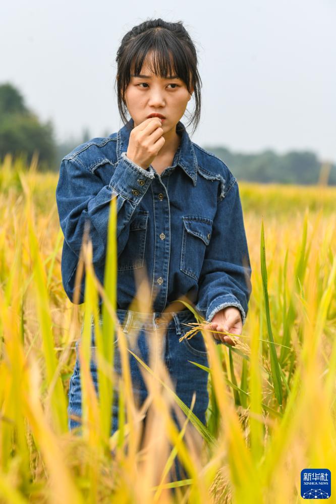 10月10日,在成都市雙流區彭鎮,王伶俐在查看今年成熟水稻的品質(zhì)。