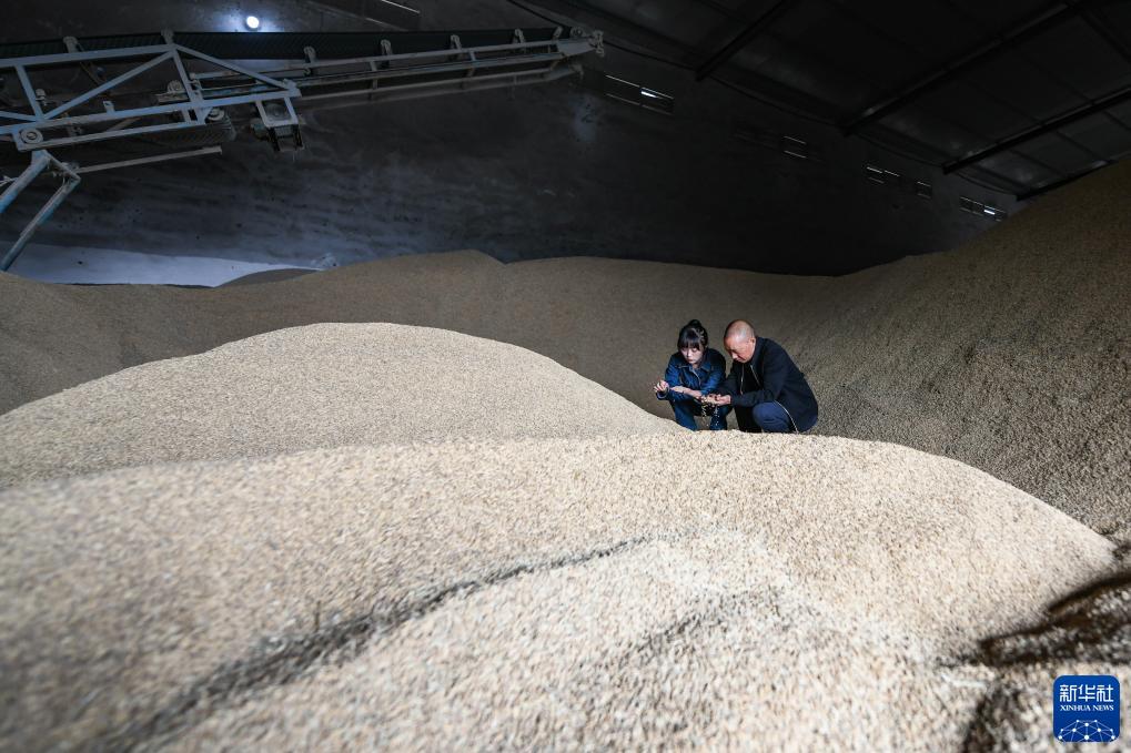 10月10日,在成都崇州市隆興鎮,王伶俐(左)和父親王志全在查看今年新收獲水稻的品質(zhì)。