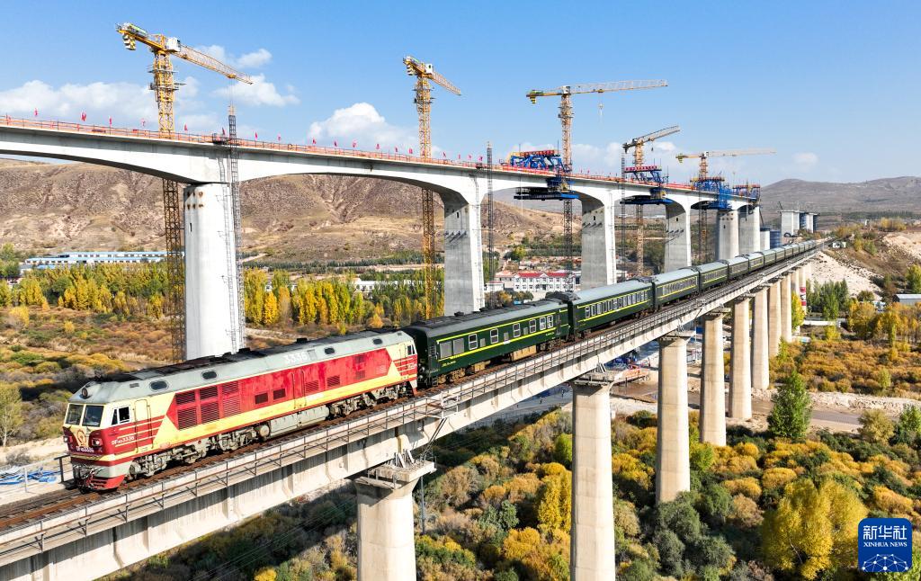 10月12日,一列客運列車(chē)在集通鐵路既有線(xiàn)上行駛,上方為建設中的集通鐵路電氣化改造工程多倫河特大橋剛構連續梁(無(wú)人機照片)。