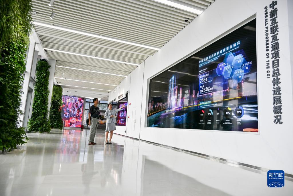 人們在位于重慶來(lái)福士的中新互聯(lián)互通項目展廳內參觀(guān)(2023年9月13日攝)。