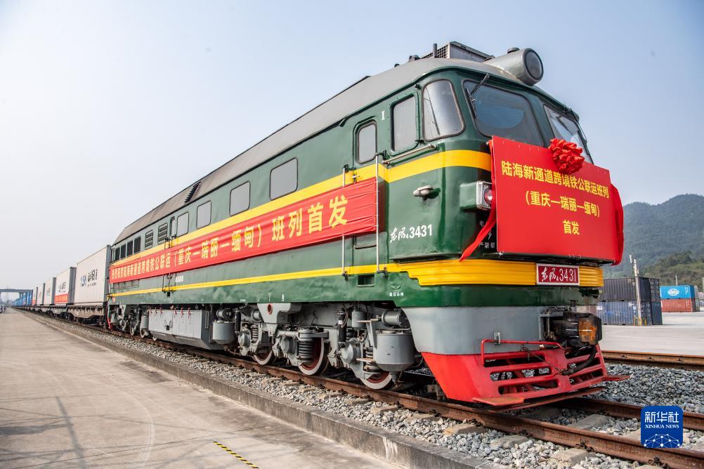 陸海新通道跨境鐵公聯(lián)運班列(重慶—瑞麗—緬甸)首發(fā)班列在重慶江津小南埡鐵路物流中心等候發(fā)車(chē)(2023年4月3日攝)。