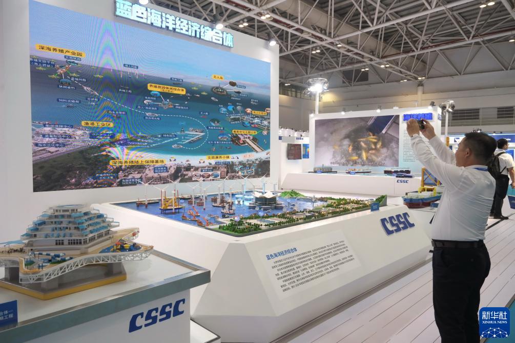 10月12日,參觀(guān)者在2023中國海洋裝備博覽會(huì )上的“藍色海洋經(jīng)濟綜合體”沙盤(pán)前拍攝。