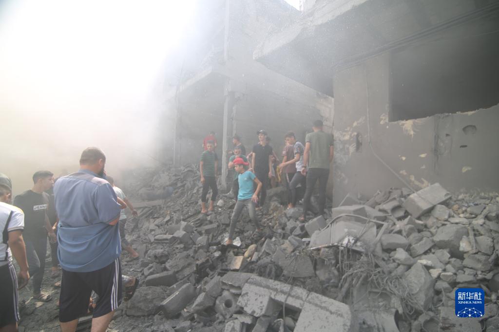 10月12日,在加沙地帶南部城市拉法,人們查看遭以色列空襲的受損建筑。