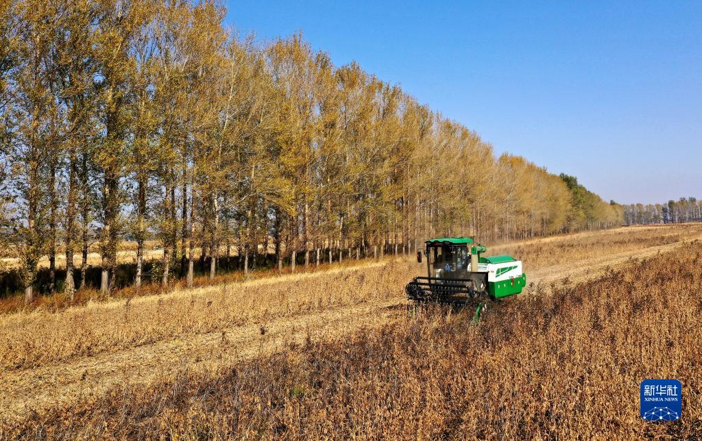 10月12日,收割機械在昌圖縣亮中橋鎮亮中村的大豆田里作業(yè)(無(wú)人機照片)。