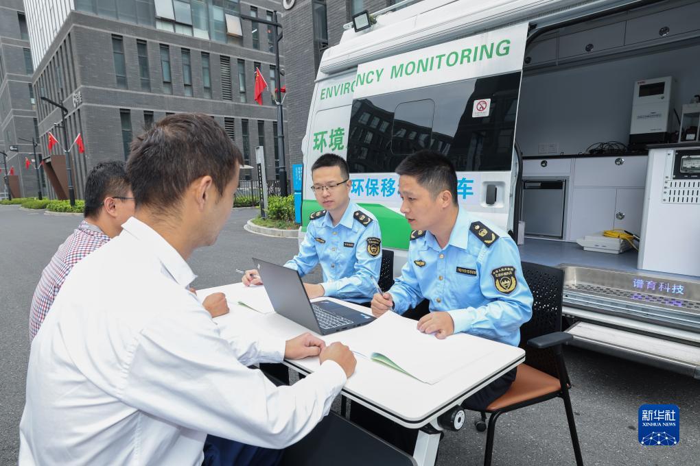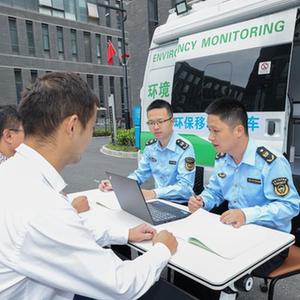 10月13日,在杭州市臨安區濱河產(chǎn)業(yè)園內,杭州市生態(tài)環(huán)境局臨安分局工作人員乘坐移動(dòng)審批車(chē)上門(mén)為企業(yè)辦理排污許可登記。