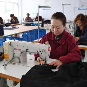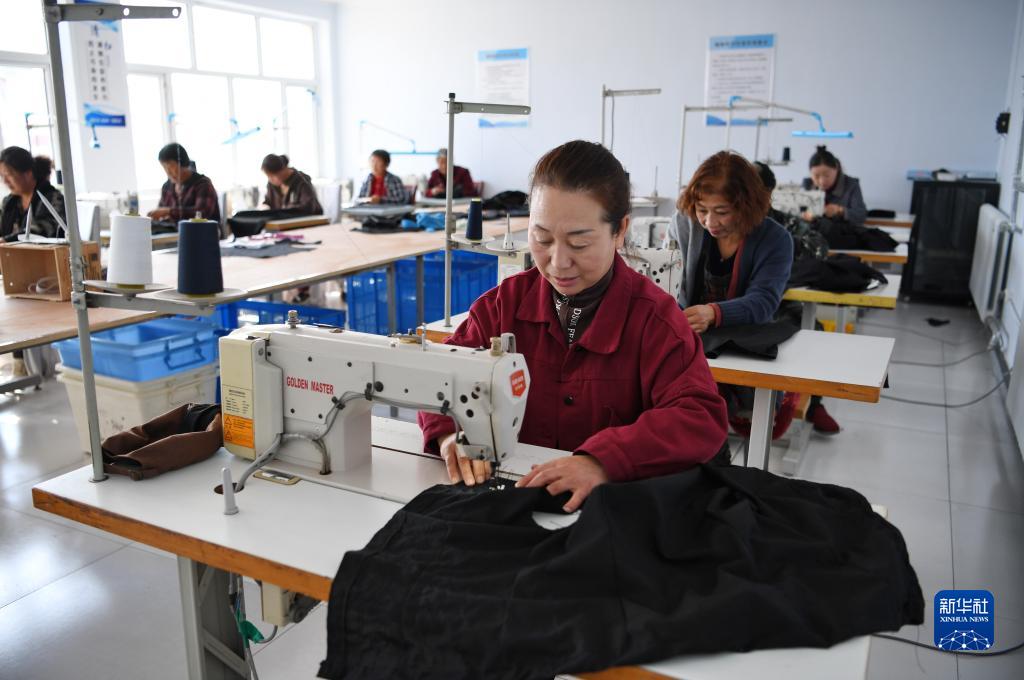 10月11日,河北省康??h張紀鎮柴家村一家服裝加工企業(yè)的工人在縫制服裝。