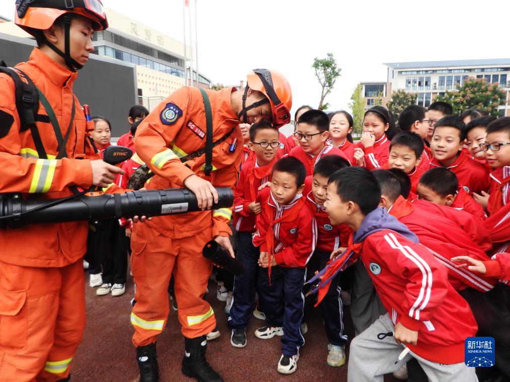 10月13日,在四川省達州市高新區實(shí)驗學(xué)校,達州市應急救援支隊消防員給學(xué)生普及消防知識。