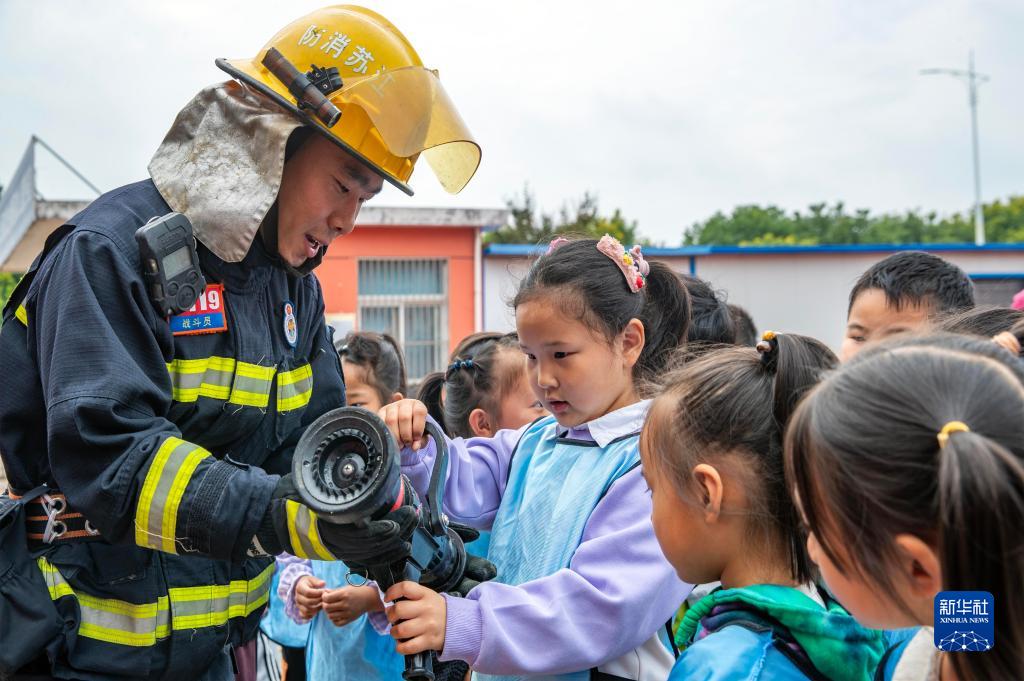 10月13日,消防救援人員在江蘇省泰州市姜堰區顧高幼兒園給小朋友普及消防知識。
