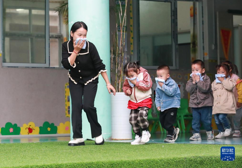 10月13日,貴州省黔東南苗族侗族自治州從江縣剛邊壯族鄉中心幼兒園的小朋友在老師的指導下進(jìn)行火災應急疏散演練。