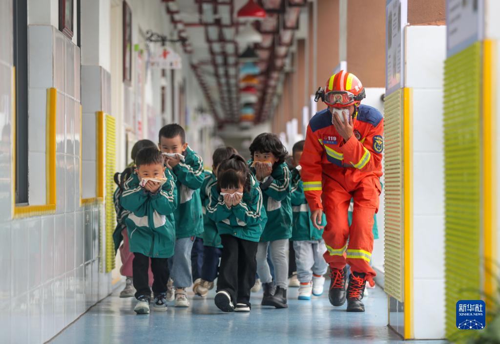 10月13日,消防員在貴州省開(kāi)陽(yáng)縣第二幼兒園帶領(lǐng)孩子們模擬火災現場(chǎng)緊急疏散。