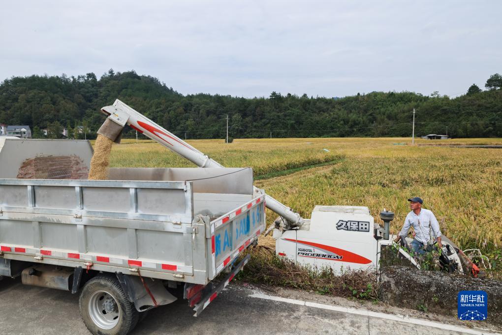 10月13日,在杭州臨安太陽(yáng)鎮的杭州臨安元生糧油專(zhuān)業(yè)合作社生態(tài)稻田內,種植戶(hù)把收獲的生態(tài)稻谷裝車(chē)。