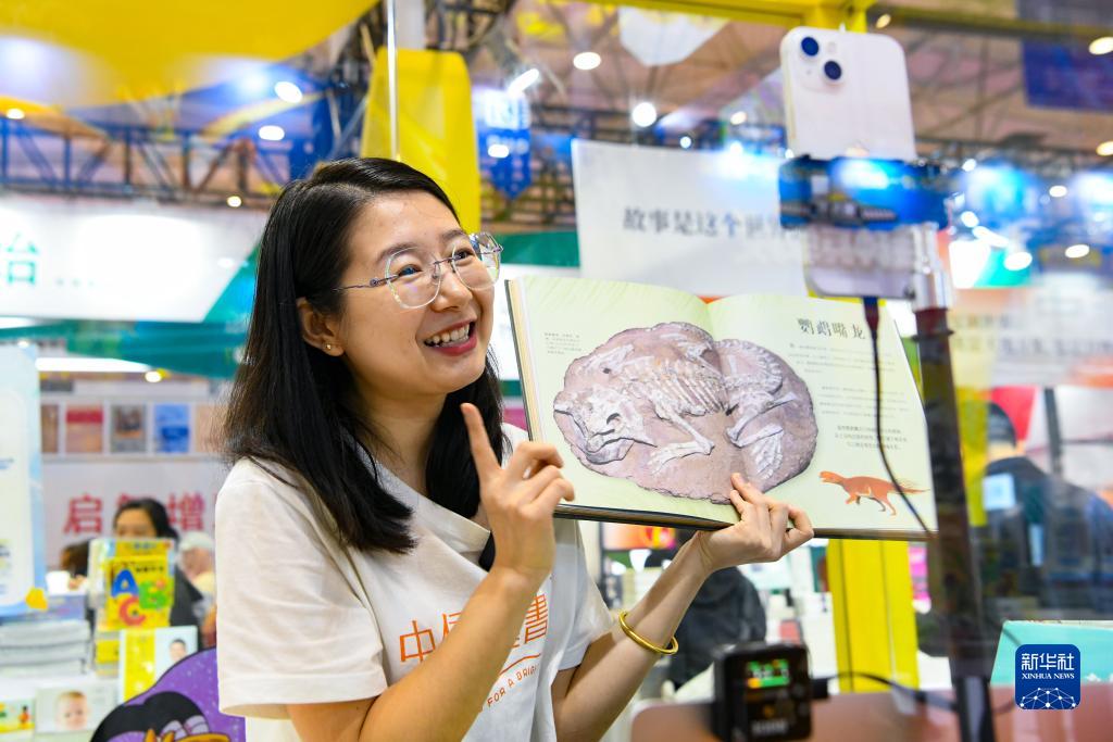 10月13日,在位于成都市世紀城新國際會(huì )展中心的2023天府書(shū)展主展場(chǎng),工作人員在直播售賣(mài)圖書(shū)。