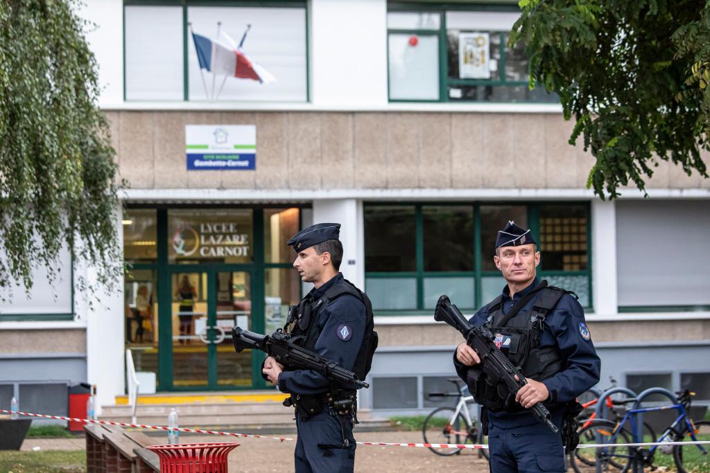 10月13日,在法國北部城市阿拉斯,警察在發(fā)生襲擊事件的甘貝塔高中外警戒。