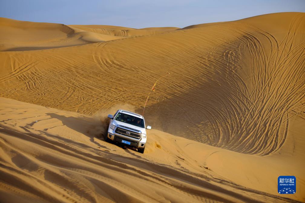 10月13日,一輛越野車(chē)在內蒙古阿拉善左旗騰格里沙漠中奔馳。