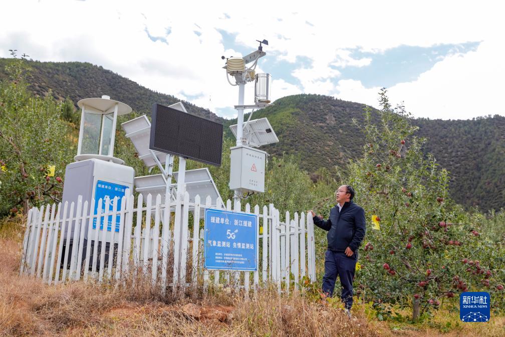 10月13日,在鄉城縣“蘋(píng)果+藏豬”種養循環(huán)現代農業(yè)園區內的有機蘋(píng)果種植示范基地,當地農牧農村和科技局的工作人員檢查氣象監測站和蟲(chóng)情監測站的運行情況。
