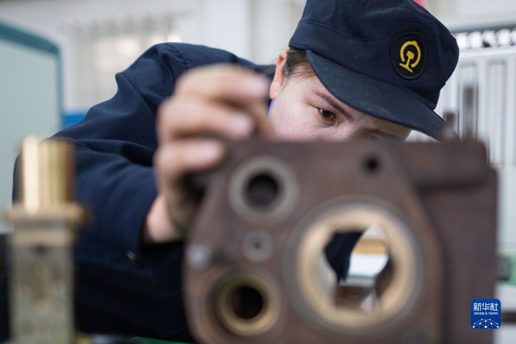 10月12日,在中國鐵路青藏集團有限公司西寧東車(chē)輛段制動(dòng)班組,馬婷在檢查120閥主閥內腔。