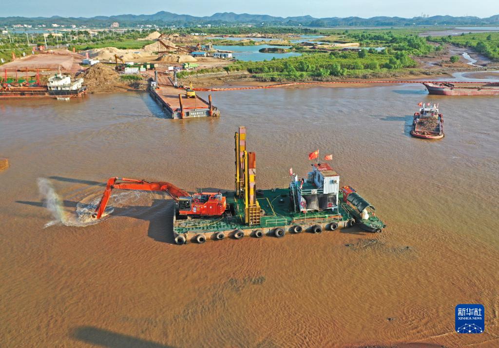 施工機械在平陸運河入??诙芜M(jìn)行疏浚作業(yè)(10月3日攝,無(wú)人機照片)。