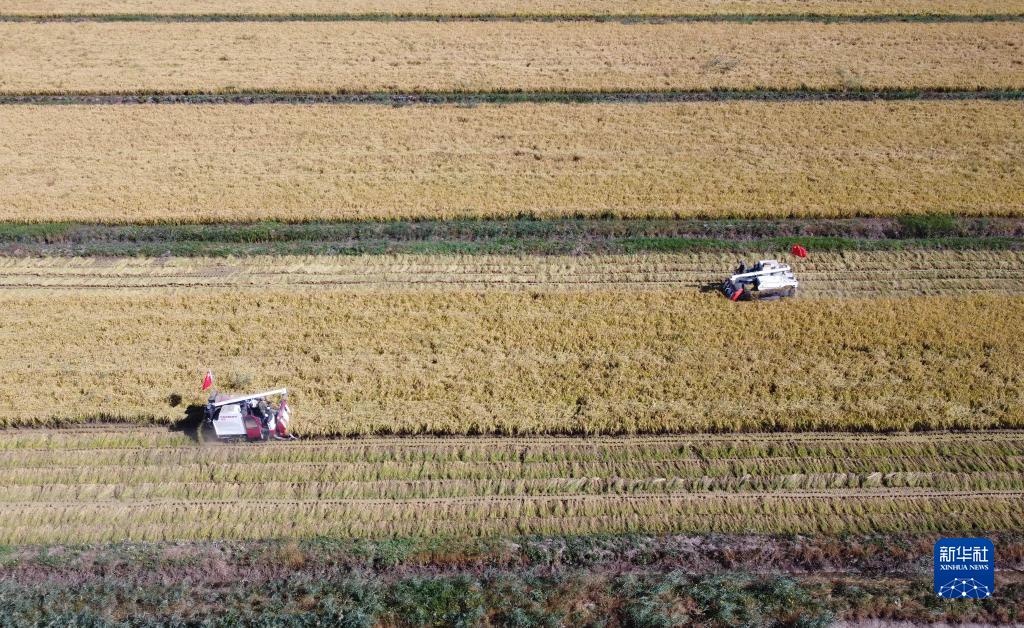 10月14日,收割機在天津市津南區小站鎮會(huì )館村小站稻核心種植區作業(yè)(無(wú)人機照片)。