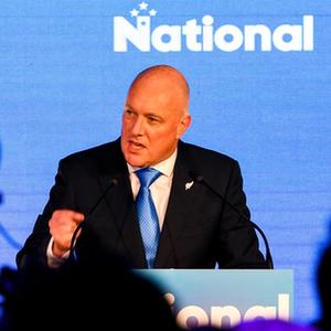 10月14日,在新西蘭奧克蘭,新西蘭國家黨領(lǐng)導人盧克森(中)向支持者致意。