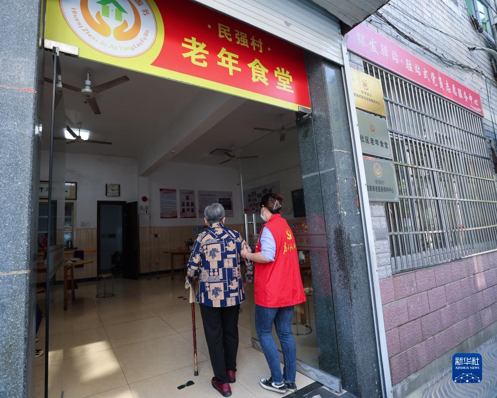 10月15日,黨員志愿者扶著(zhù)老人到杭州市富陽(yáng)區里山鎮民強村老年食堂就餐。