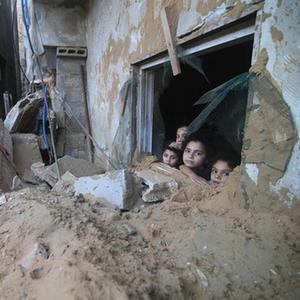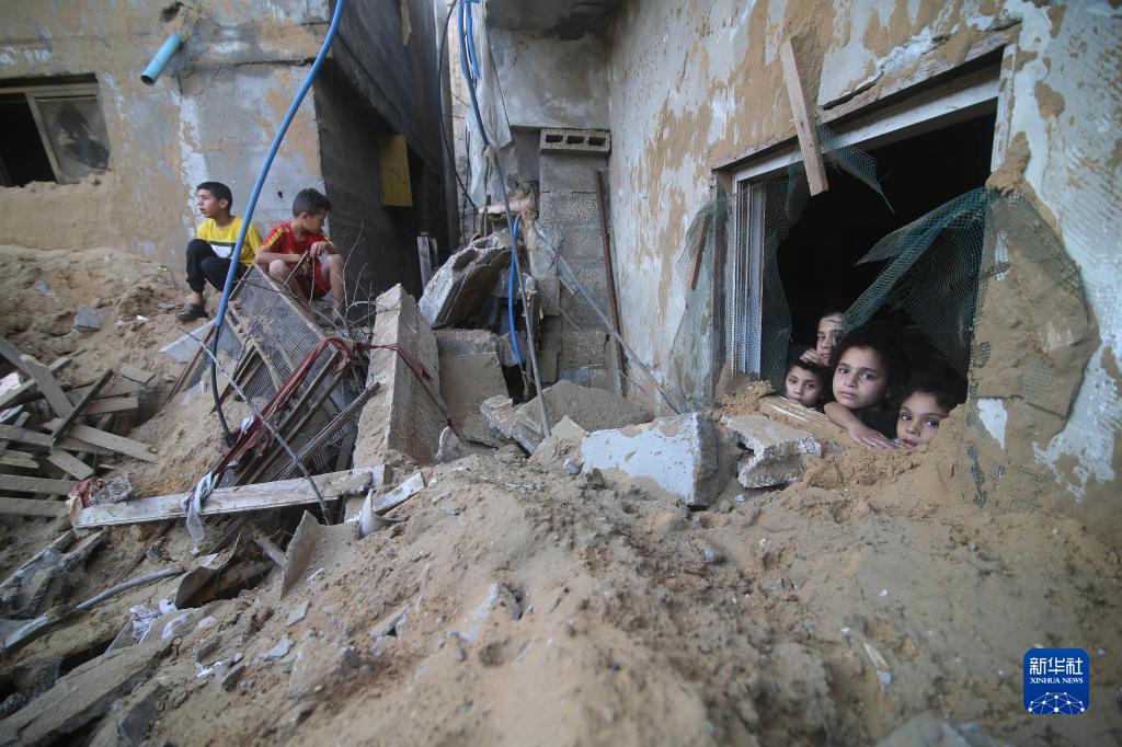 10月15日,在加沙地帶南部城市拉法,兒童在遭以色列空襲后的受損建筑中向外張望。