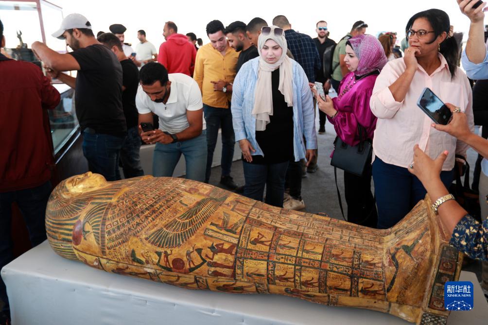 10月15日,在埃及明亞省考古現場(chǎng),人們參觀(guān)彩繪木乃伊棺槨。
