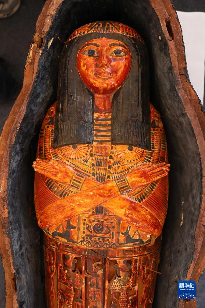 這是10月15日在埃及明亞省考古現場(chǎng)拍攝的彩繪木乃伊棺槨。