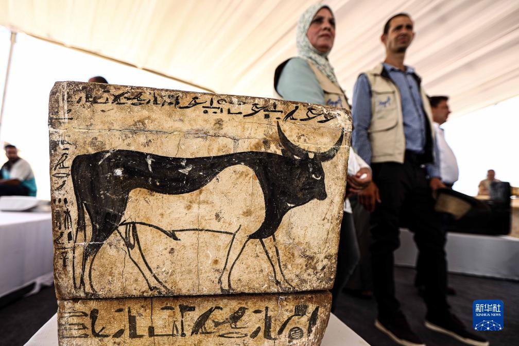 這是10月15日在埃及明亞省考古現場(chǎng)拍攝的彩繪棺槨上的圖案。