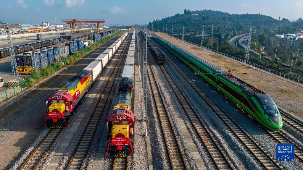 10月16日,在云南省玉溪市研和站,D887次復興號中老鐵路國際旅客列車(chē)(右)從中老、中越國際冷鏈貨運班列旁駛過(guò)(無(wú)人機照片)。