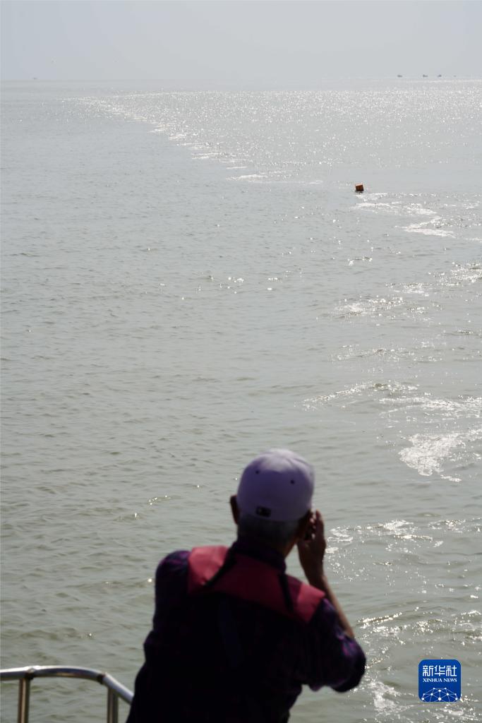 10月12日,在黃河入???,游客在船上拍攝黃河與渤海交匯。