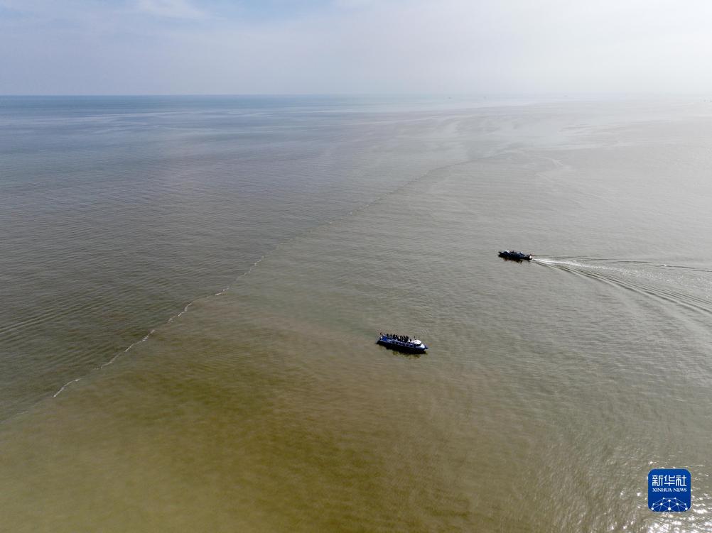 在山東省東營(yíng)市黃河入???,黃河匯入渤海。黃色的河水和藍色的海水之間形成了一條“分界線(xiàn)”,河黃海清,涇渭分明。