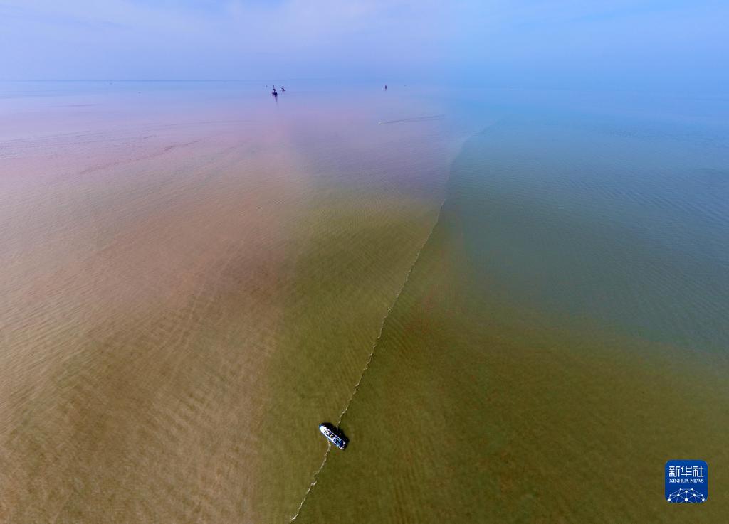 在山東省東營(yíng)市黃河入???,黃河匯入渤海。黃色的河水和藍色的海水之間形成了一條“分界線(xiàn)”,河黃海清,涇渭分明。