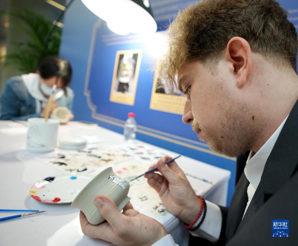 10月16日,在第三屆“一帶一路”國際合作高峰論壇新聞中心,來(lái)自匈牙利的記者體驗北京仿古瓷制作技藝。