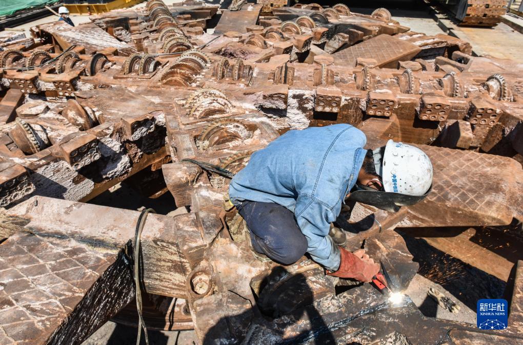 10月16日,施工人員為出洞的“開(kāi)路先鋒1號”盾構機刀盤(pán)進(jìn)行焊接作業(yè)。