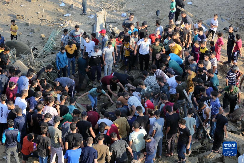 10月16日,在加沙地帶南部城市汗尤尼斯,人們在遭以色列襲擊后的建筑廢墟中救援傷者。