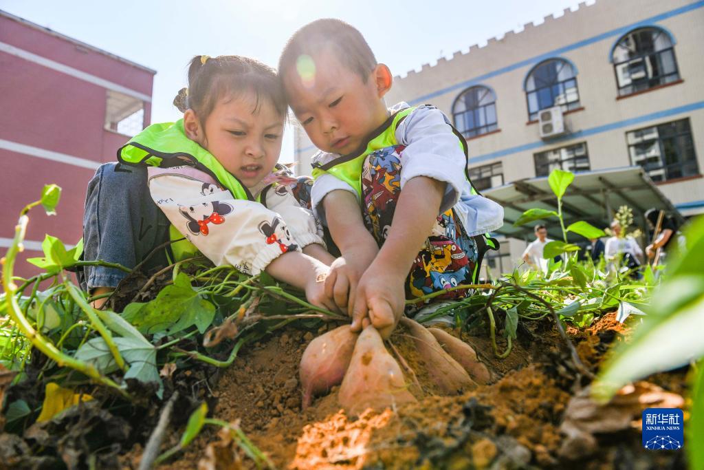 10月16日,湖南省永州市道縣城東幼兒園的小朋友在體驗采收紅薯。
