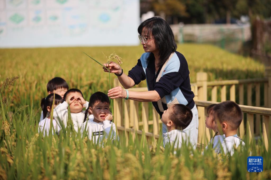 10月16日,浙江省湖州市吳興區埭溪鎮中心幼兒園的老師在稻田里給小朋友講解水稻知識。