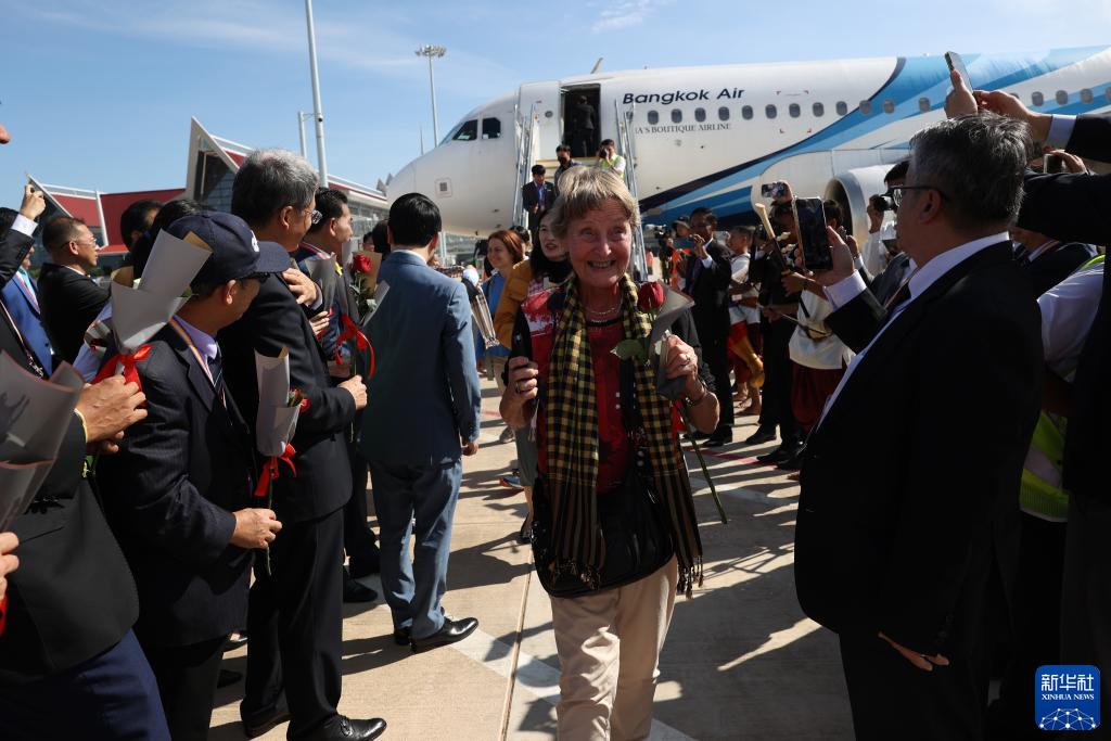 10月16日,在柬埔寨暹粒吳哥國際機場(chǎng),首架進(jìn)港客機乘客受到夾道歡迎。