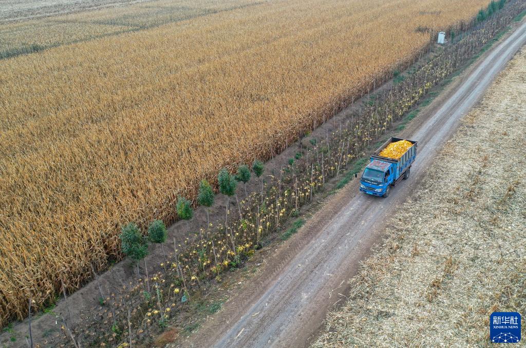 10月13日,通遼市科爾沁區錢(qián)家店鎮前西艾力村村民駕駛農用車(chē)將收獲的玉米運回家(無(wú)人機照片)。