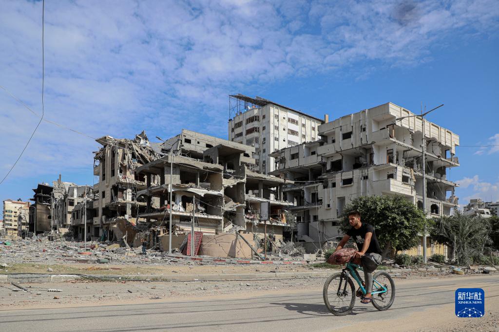 10月17日,在加沙城,一名男子騎行經(jīng)過(guò)遭襲擊損毀的建筑。