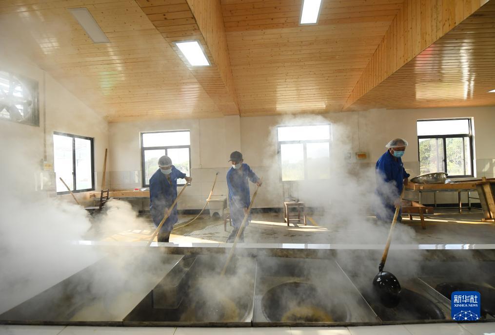 10月17日,豐江周村村民在共富工坊內熬制紅糖。
