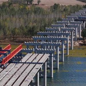 10月17日,工人在唐山灤州市內的秦唐高速公路跨灤河大橋建設工地施工(無(wú)人機照片)。