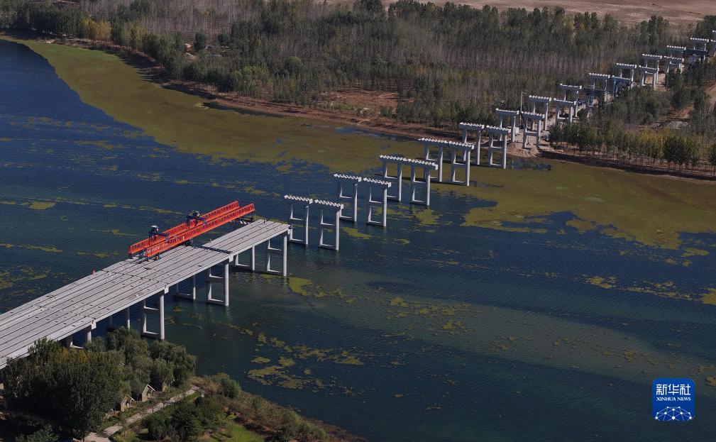 10月17日,工人在唐山灤州市內的秦唐高速公路跨灤河大橋建設工地施工(無(wú)人機照片)。