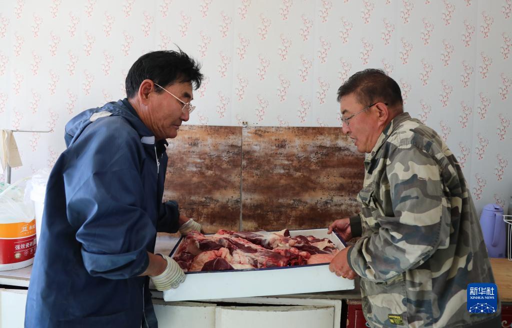 10月16日,道爾吉(右)和朋友將羊肉放置儲存。
