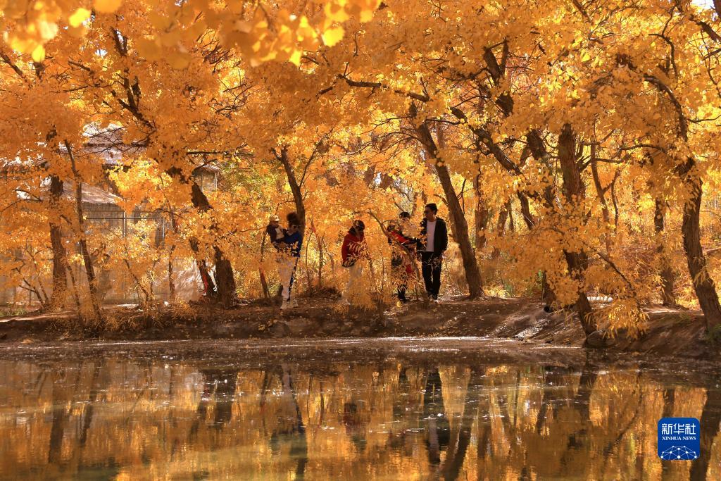 10月17日,游客在甘肅省敦煌市莫高鎮的胡楊林中賞景。