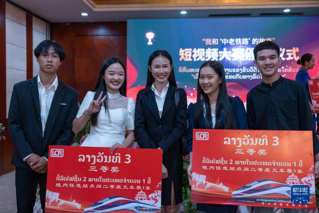 由中國駐老撾大使館舉辦的“我和‘中老鐵路’的故事”短視頻大賽16日在老撾首都萬(wàn)象舉行頒獎儀式。老撾新聞文化旅游部副部長(cháng)萬(wàn)西與中國駐老撾大使館臨時(shí)代辦王暢共同為獲獎?wù)哳C獎。