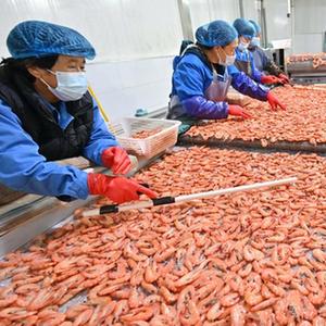 10月17日,工人在河北省唐山市曹妃甸區一家水產(chǎn)加工企業(yè)的南美白對蝦加工生產(chǎn)線(xiàn)上工作。