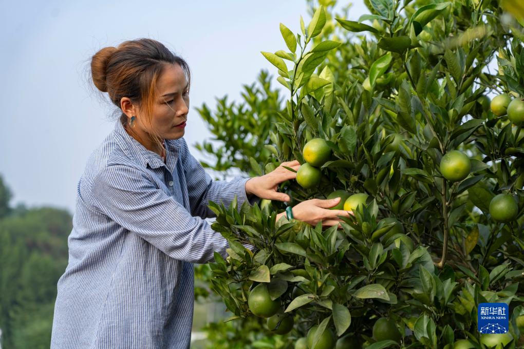 10月17日,在位于四川資中縣銀山鎮的橙堡魚(yú)鄉融合發(fā)展示范園,村民查看血橙掛果情況。